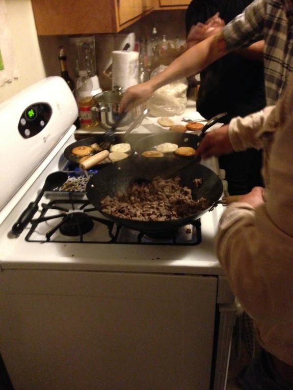 yo tengo hambre, i’m starving by the time i reach the dinner party, i ring the door bell and a smiling face lets me in, it’s so crowded already, boots off i walk back to la cocina to say hello to the friend who invited me, 3 dudes already cooking, the smells, the energy, it’s beautiful, i find a cold negro modelo especial in a cooler, the first course, sopa de beans and bacon already warming my hands